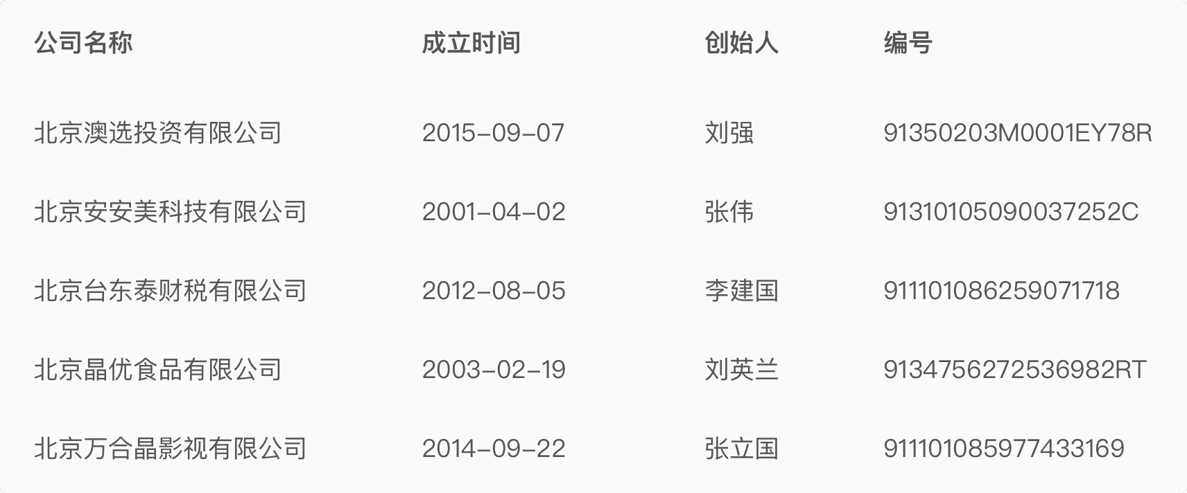 | 公司名稱(chēng) | 成立時(shí)間 | 創(chuàng)始人 | 編號(hào) |